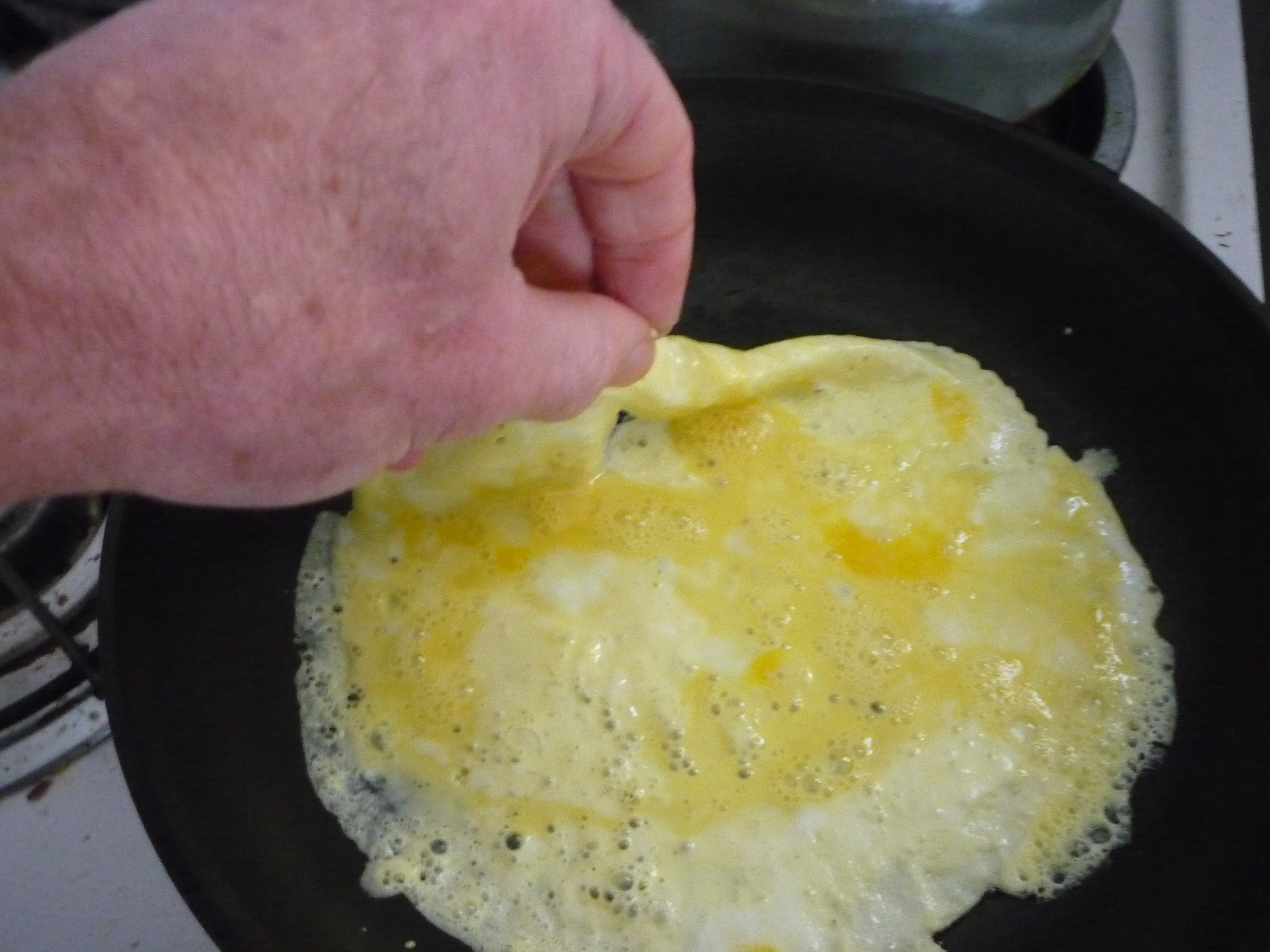 - Scramble egg with about a teaspoon of water. When oil shimmers, add egg to pan and swirl around the pan (crepe style) until bottom is covered.