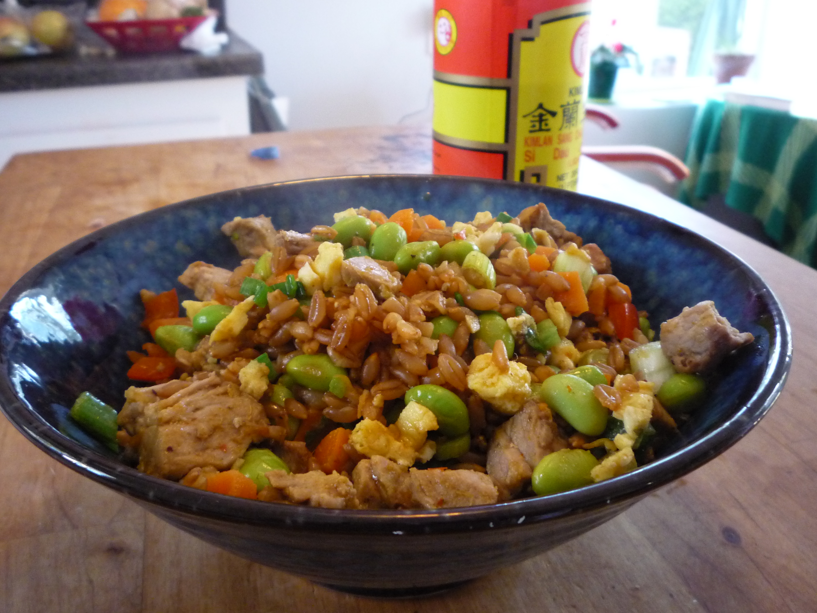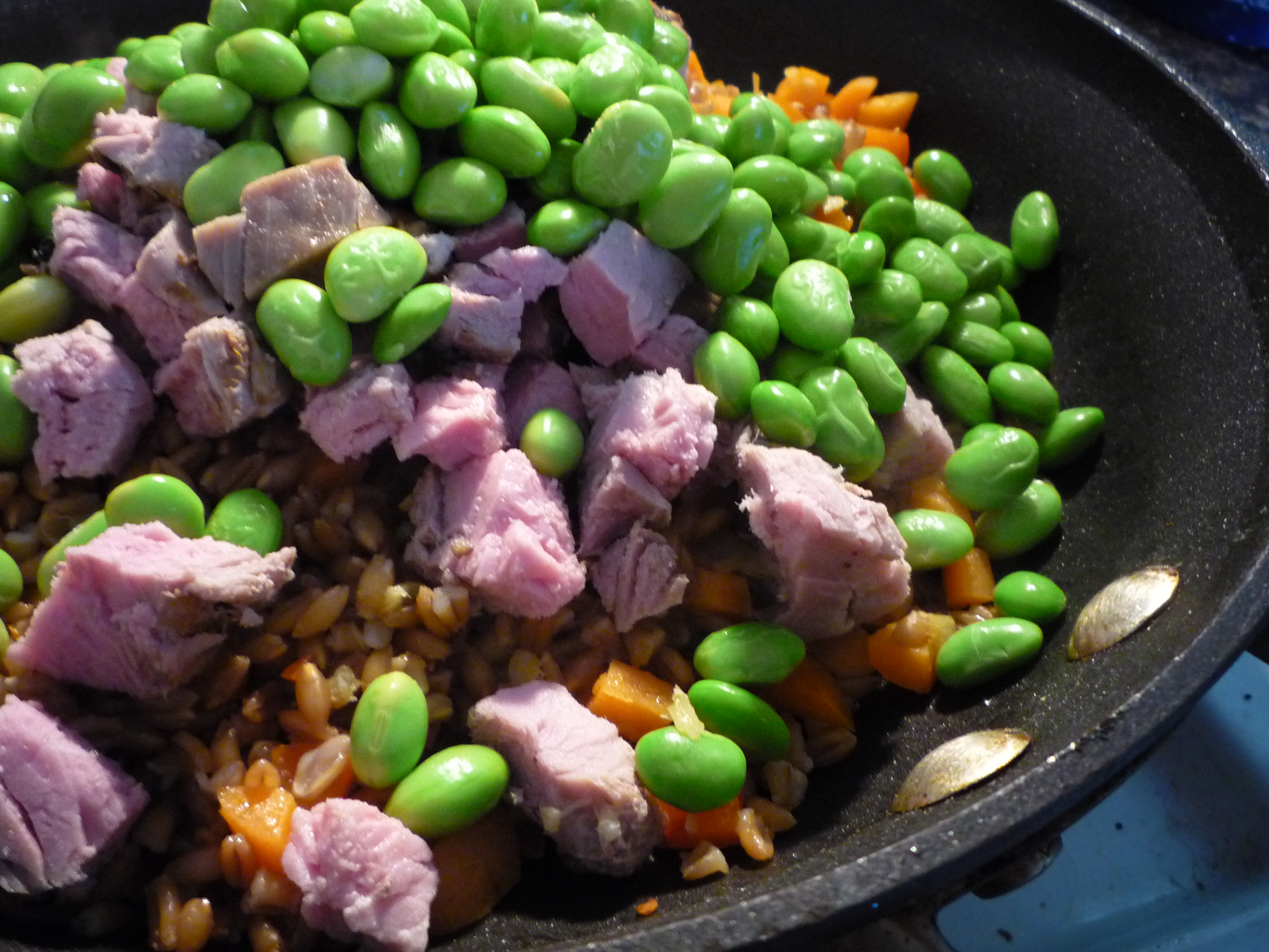 - Lower heat to medium and add farro. Stir around until farro is heated through—about 3 minutes. Add edamame, pork and soy sauce. If you’d like a little heat, add the sambal or an appropriate amount of your favorite hot condiment. Stir to combine.
