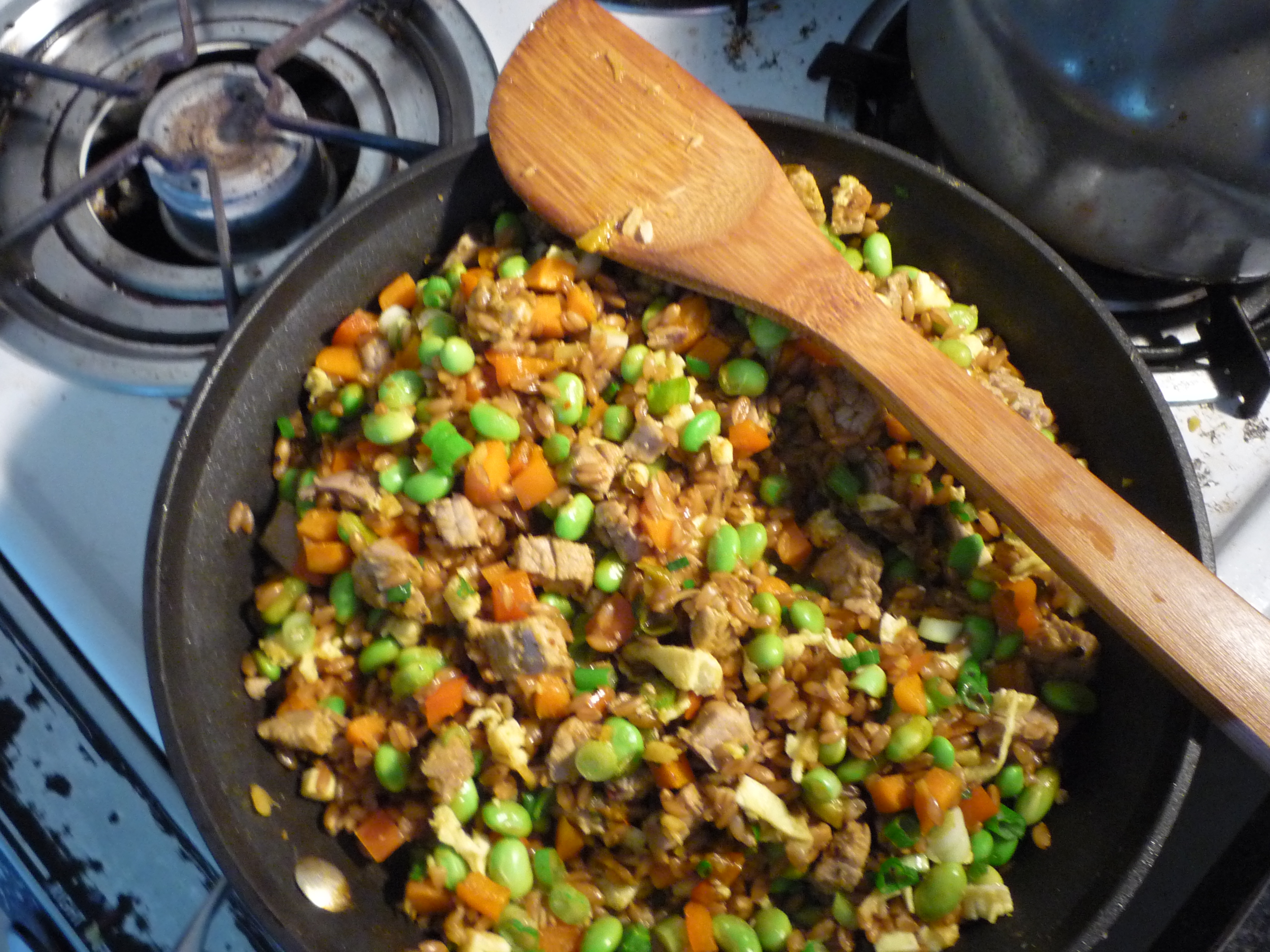 along with a few veggies, is always a good excuse to make pork fried rice. In fact, I often cook extra rice just for that purpose. Last night, I found myself with the pork and the vegetables, but the leftover grain was farro. Farro is an old Italian grain that’s similar to wheat. However, farro cooks much more quickly than wheat berries. Just put them in a sauce pan with enough water to cover by about and inch and a half and simmer for about 15 minutes. Farro is a nice alternative to rice as a side dish and is great in soups and salads. I’ve even been known to eat cold leftover farro for breakfast with a little yogurt and some fresh berries. I think the word “toothsome” is a little overused as a food descriptor, but the term hits the mark with farro. It’s tender to the bite, but definitely holds its shape. It has a light nutty flavor with a hint of barley (but without that sliminess that comes with barley). It’s texture and flavor make it a natural for a fried rice style preparation.