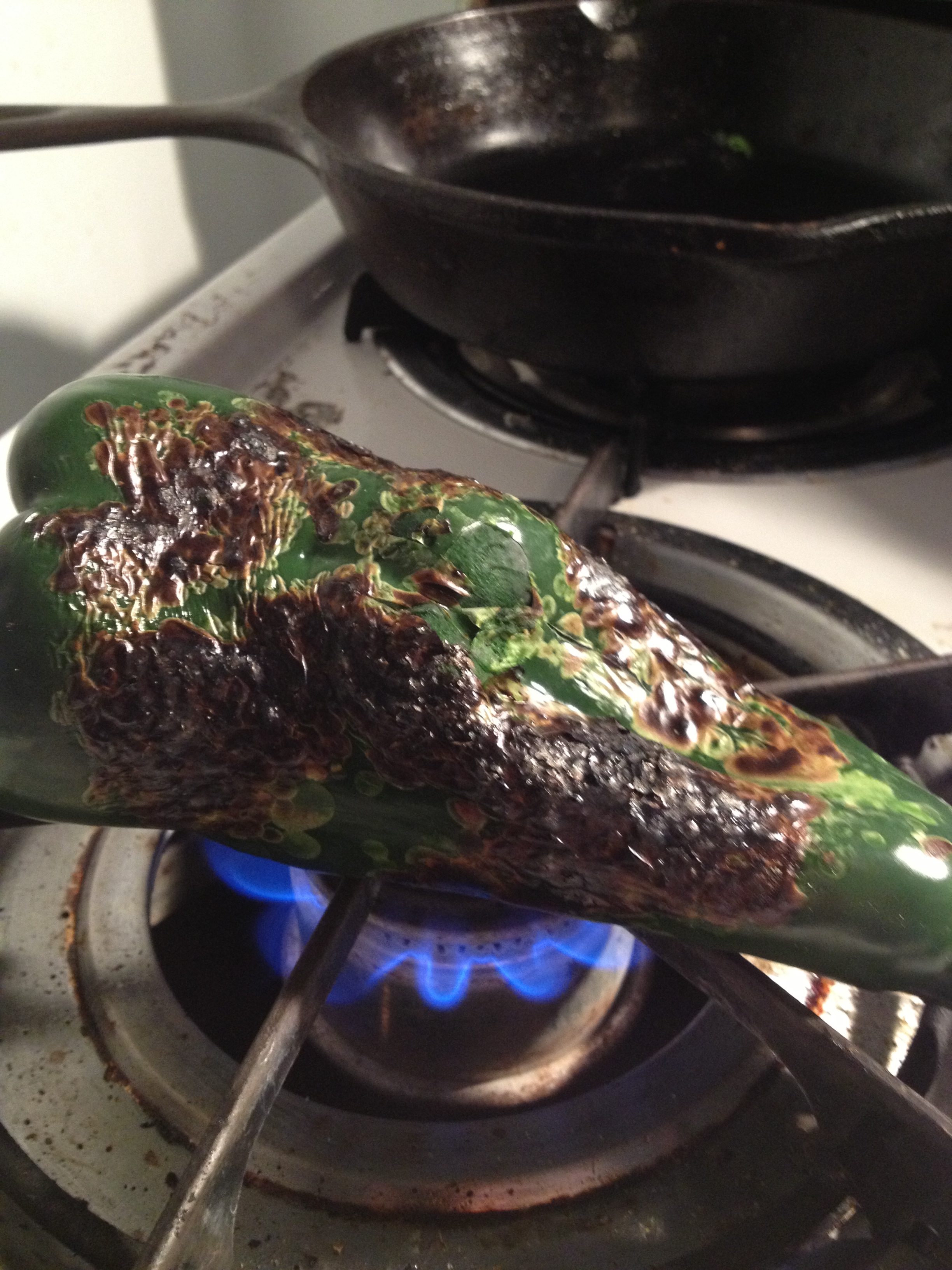 - Char the skin of the poblano pepper by either roasting under a broiler or placing directly on the burner of a gas stove turned to medium heat. Turn pepper a quarter turn as the exposed side of the pepper becomes evenly blackened. When pepper is completely blackened, place the pepper in a bowl and cover tightly with a plate or some plastic wrap—this helps create steam to loosen the skin.