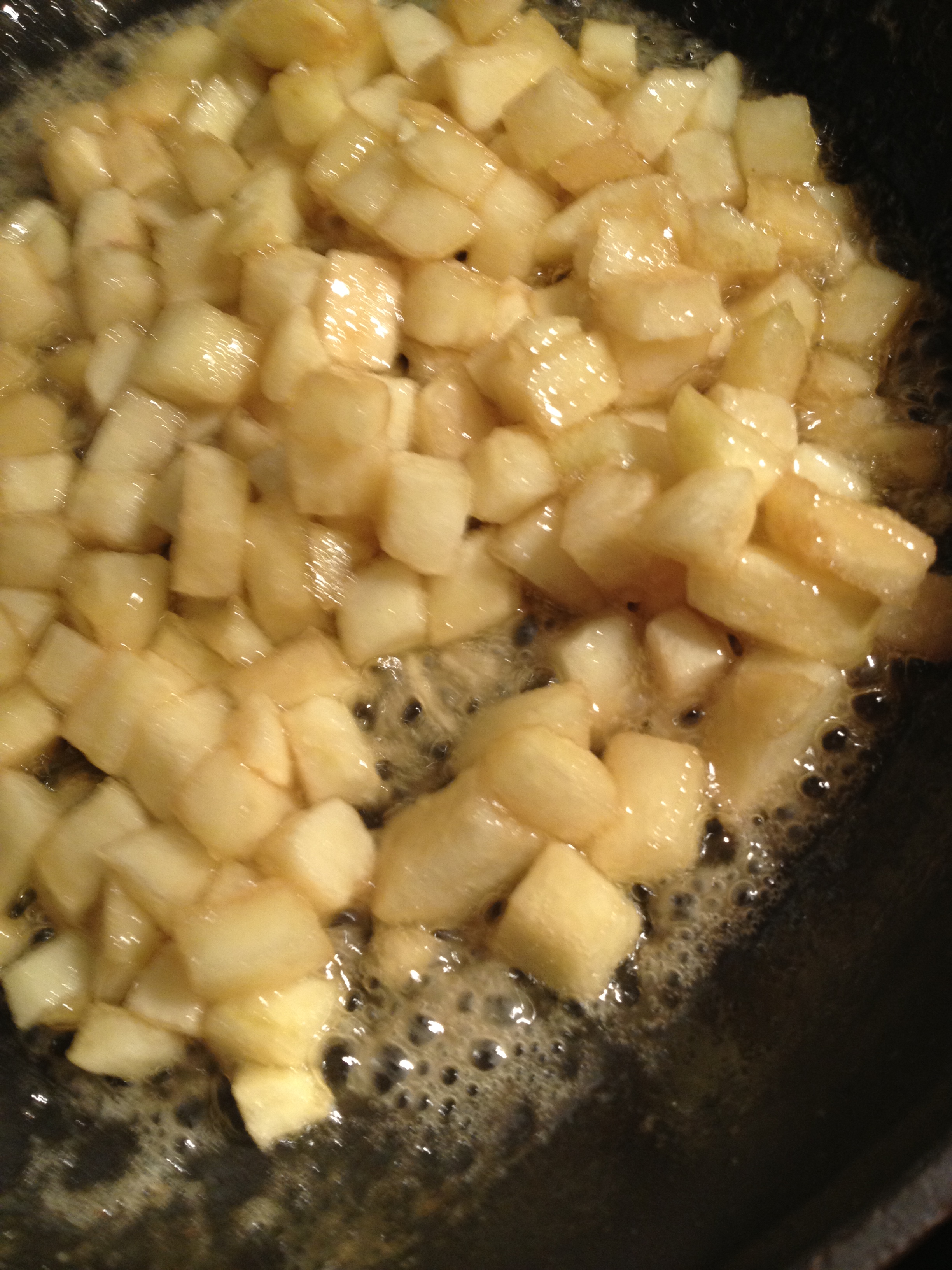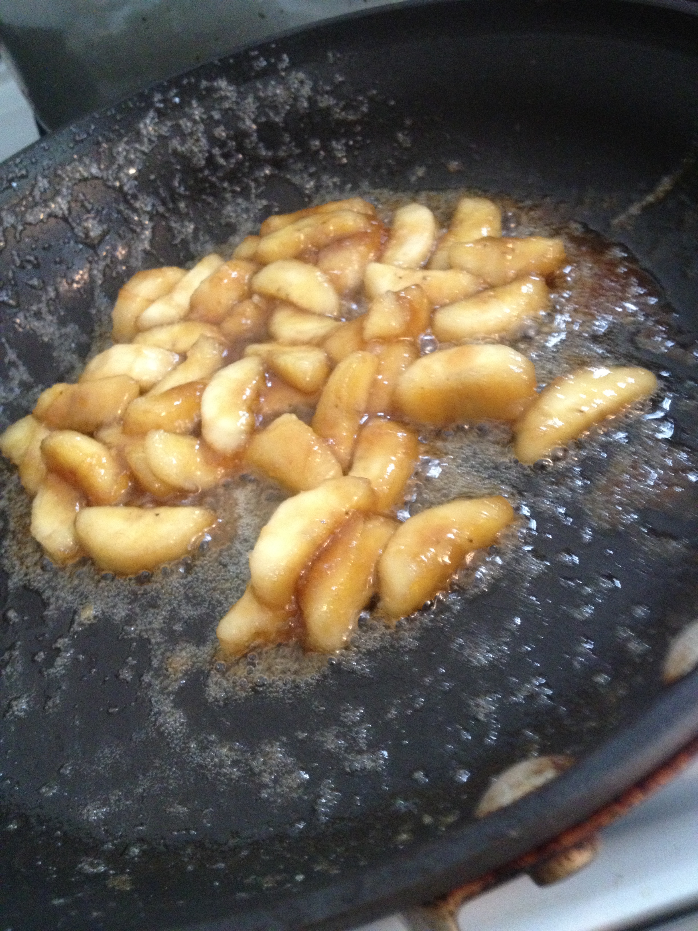 - Melt butter in sauté pan over medium heat. Add ¼ cup syrup and bring to a simmer. Add apples and toss to coat. Cook for about 5 minutes or until syrup has thickened a bit and apples are just beginning to soften.