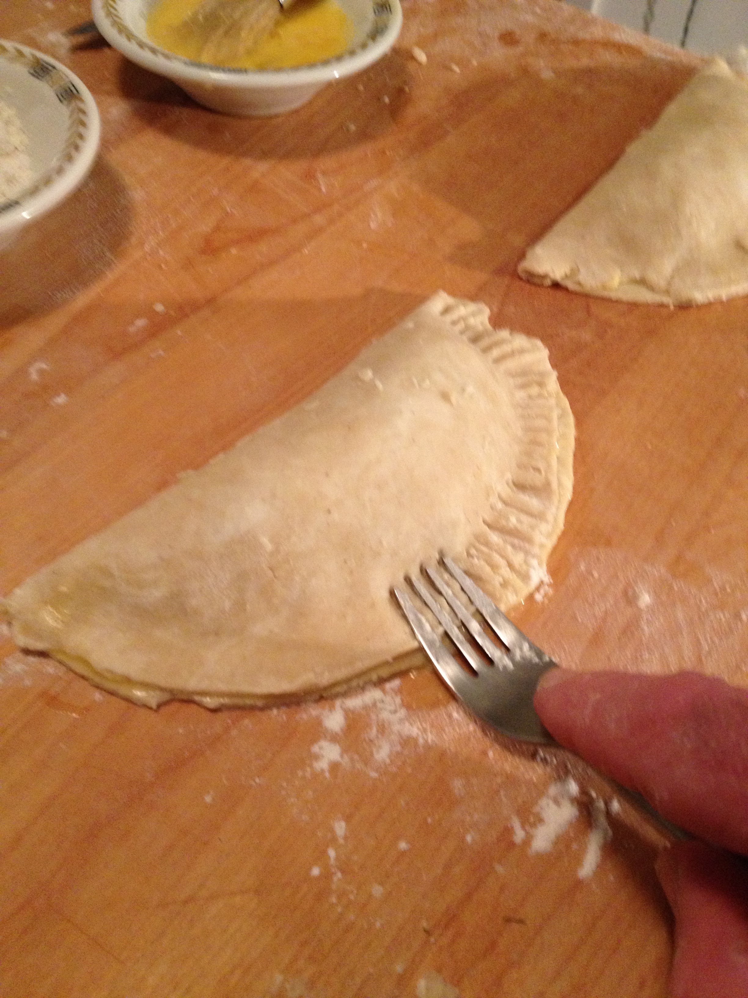 - Place about ¼ cup of the filling in the center of each dough circle. Brush the edges of the dough with egg mixture. Fold edges together and pinch with thumb and index finger. Crimp edges with a fork. If fork sticks to dough, dip it in a little flour.