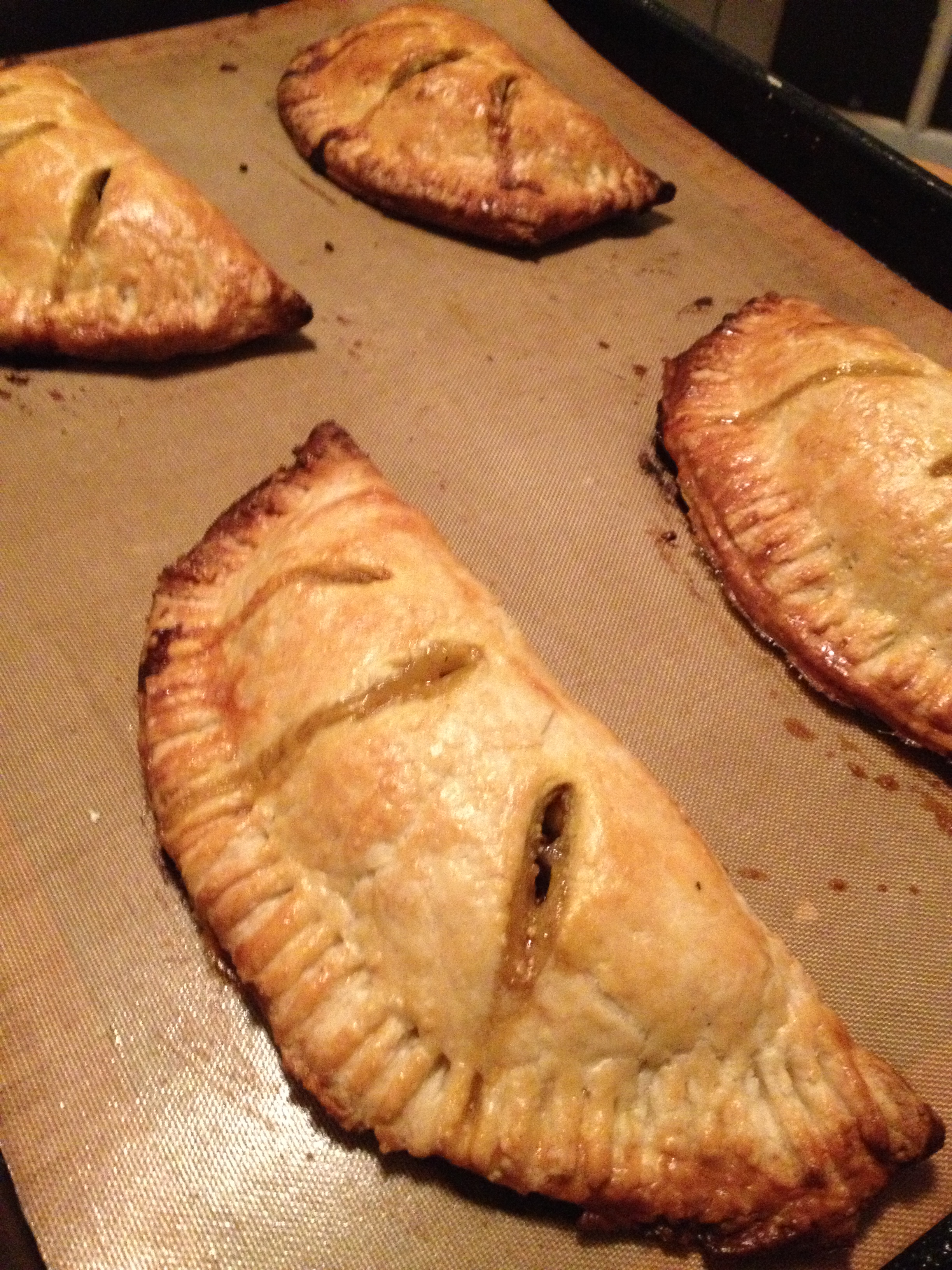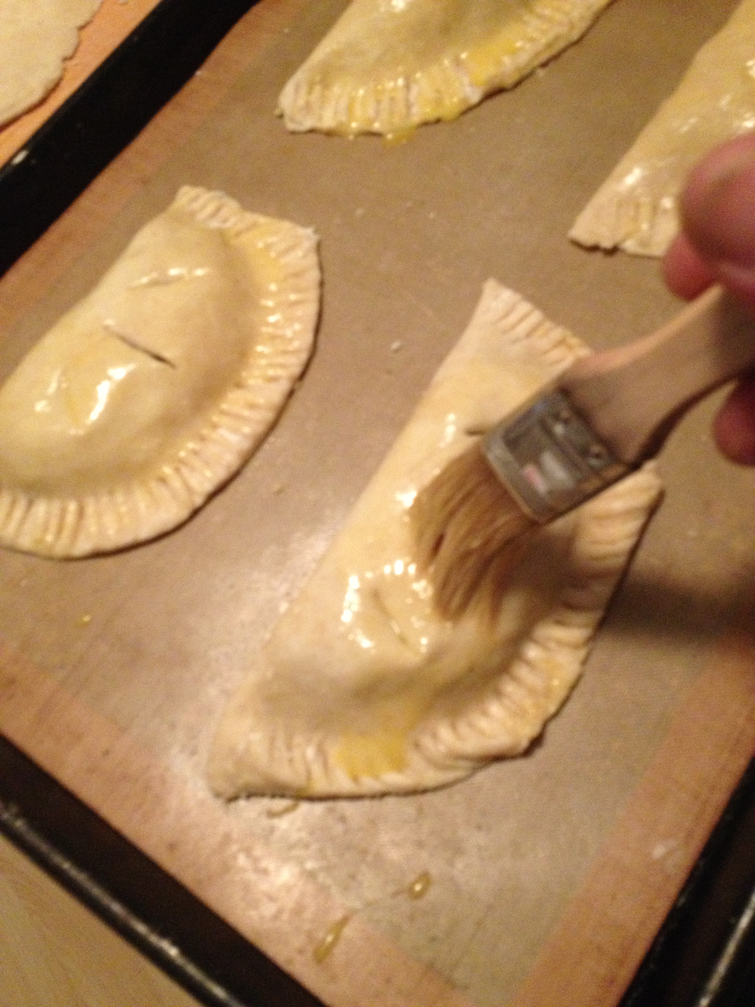 - Place pies on a parchment lined sheet pan, brush with egg wash, and bake for 25-30 minutes or until nicely browned.