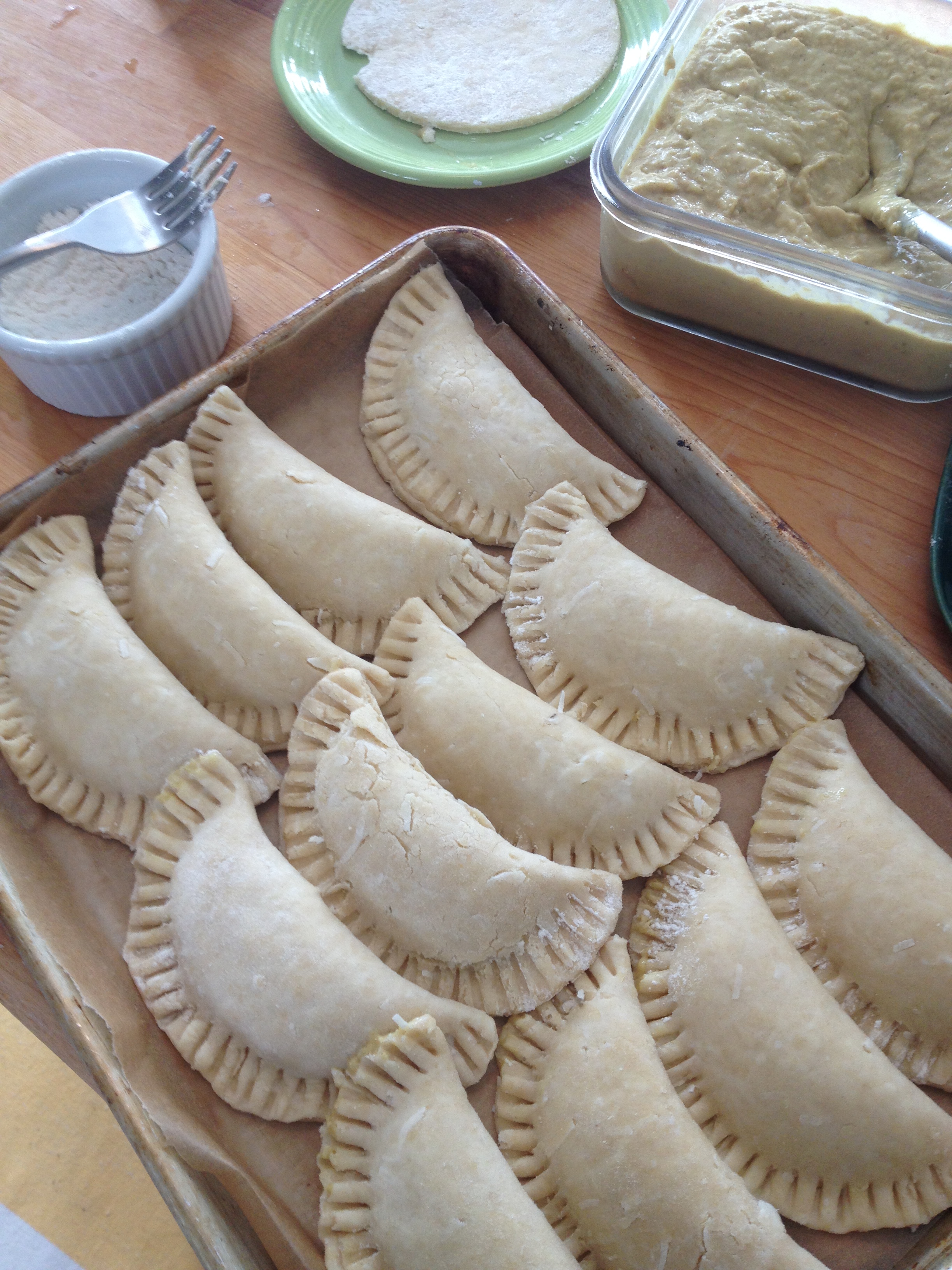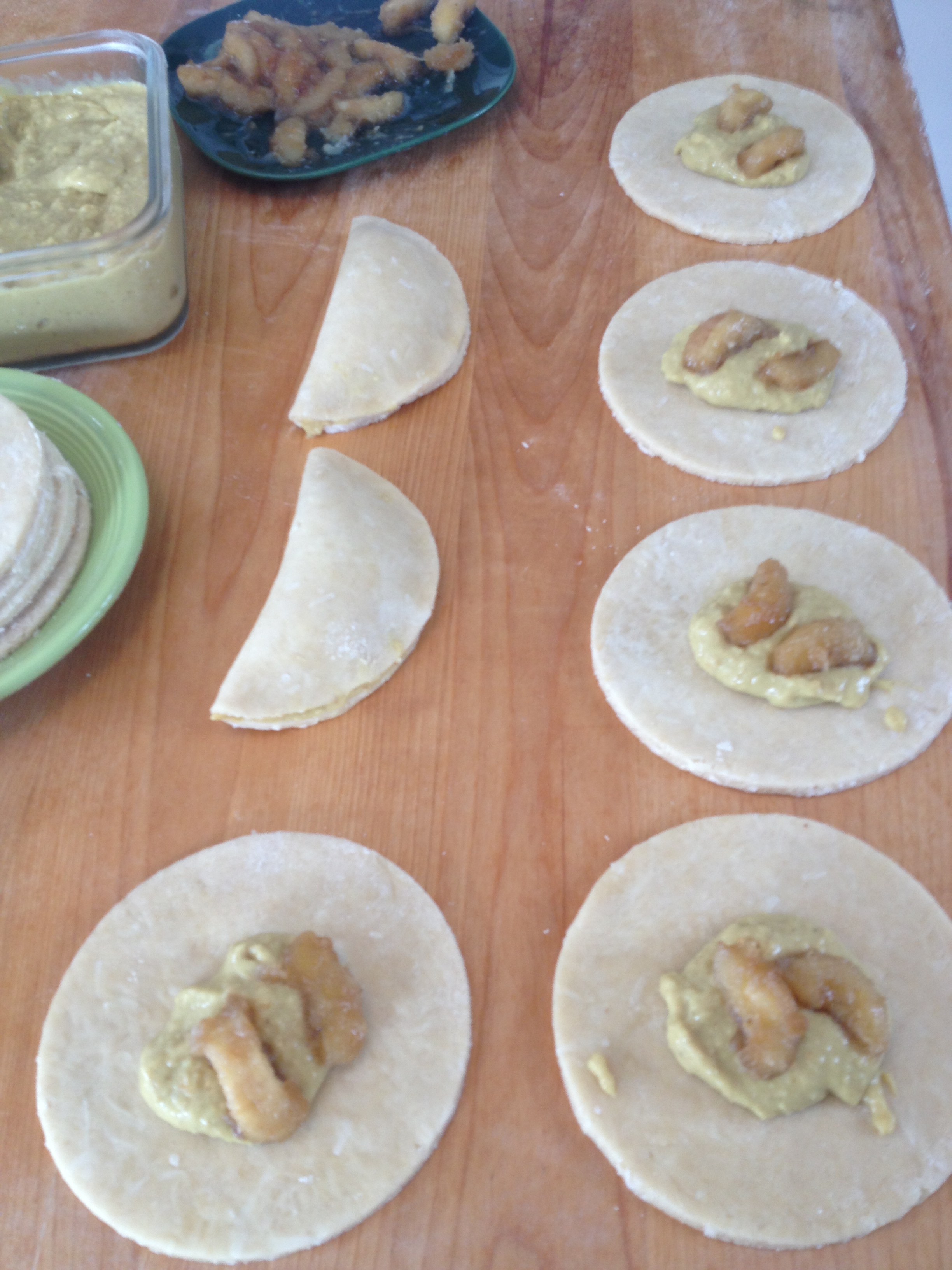 - Working in batches of 4 or 6 circles (depending on space), place about a tablespoon of filling in the center of each circle. Wipe the edges of the dough with a finger dipped in water. Fold edges together and pinch with thumb and index finger. Crimp edges with a fork. If fork sticks to dough, dip it in a little flour.
