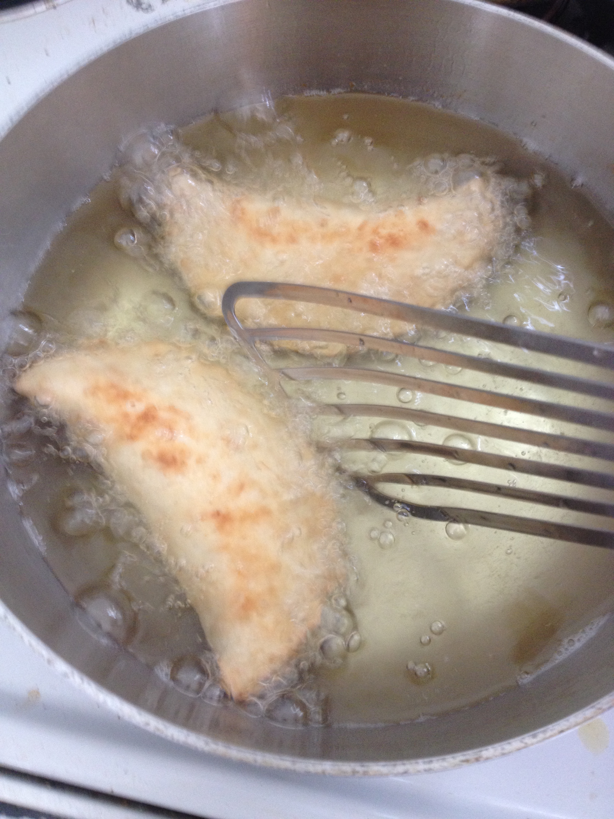 - Fry pies, two or three at a time, for about 2 minutes on each side until lightly browned. Drain on a rack over a sheet pan.