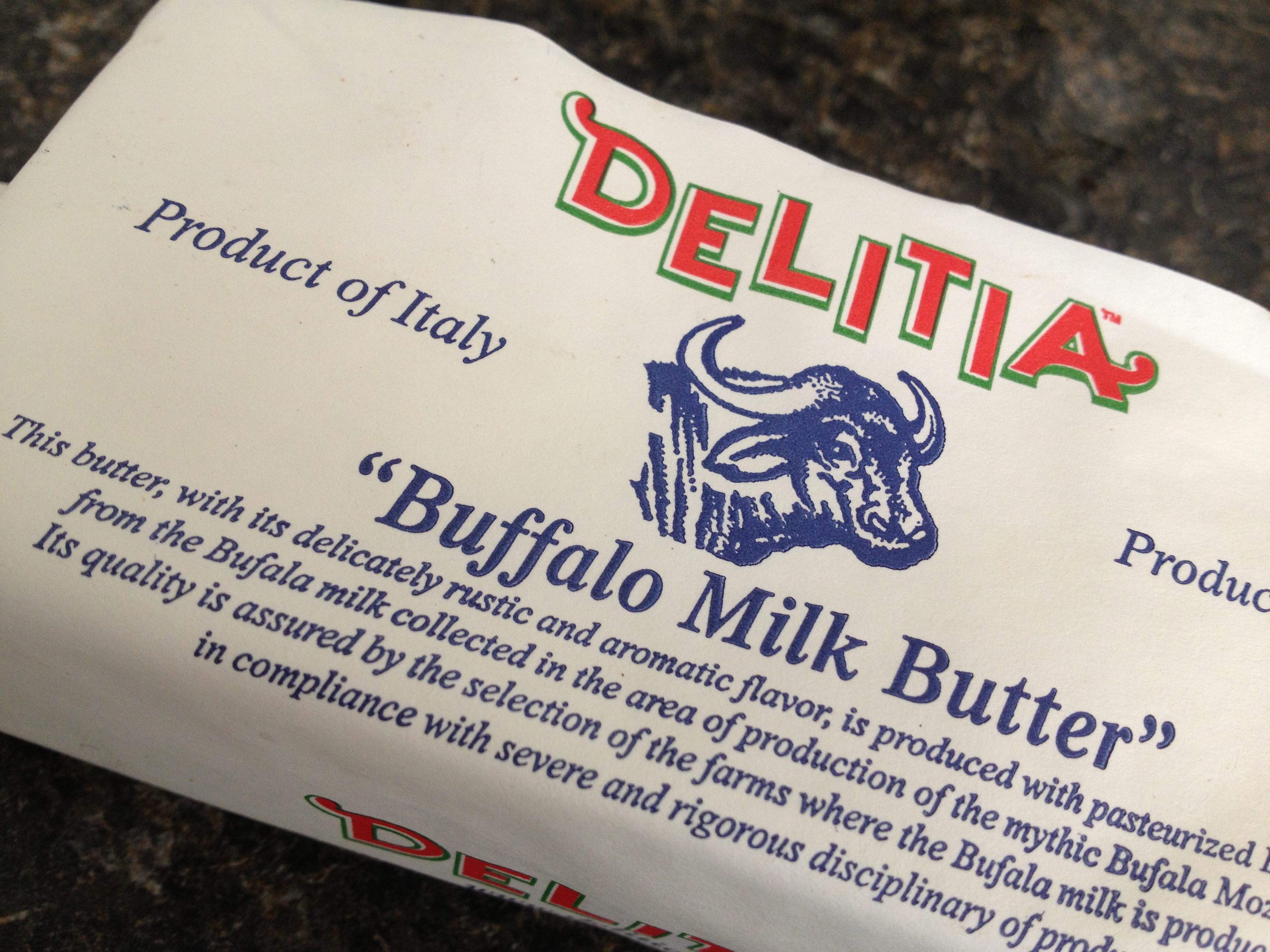- Buffalo milk butter – A rich, creamy butter with a rustic finish imported from Italy. The same company (Delitia) makes a product called Parmesan butter (also carried at BB), which I like a little better. It was, however, really good on that olive baguette with a sprinkle of coarse sea salt.