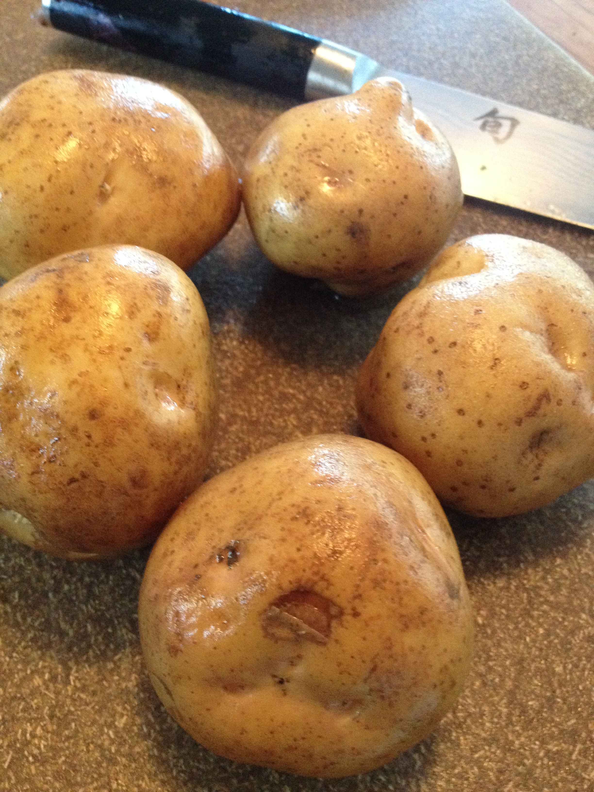 • Scrub potatoes and cut into ½” pieces. Place in a medium saucepan and cover with cold water. Add 2 Tblspns salt. Bring to a gentle boil and cook until just cooked through—about 15 minutes. Drain.