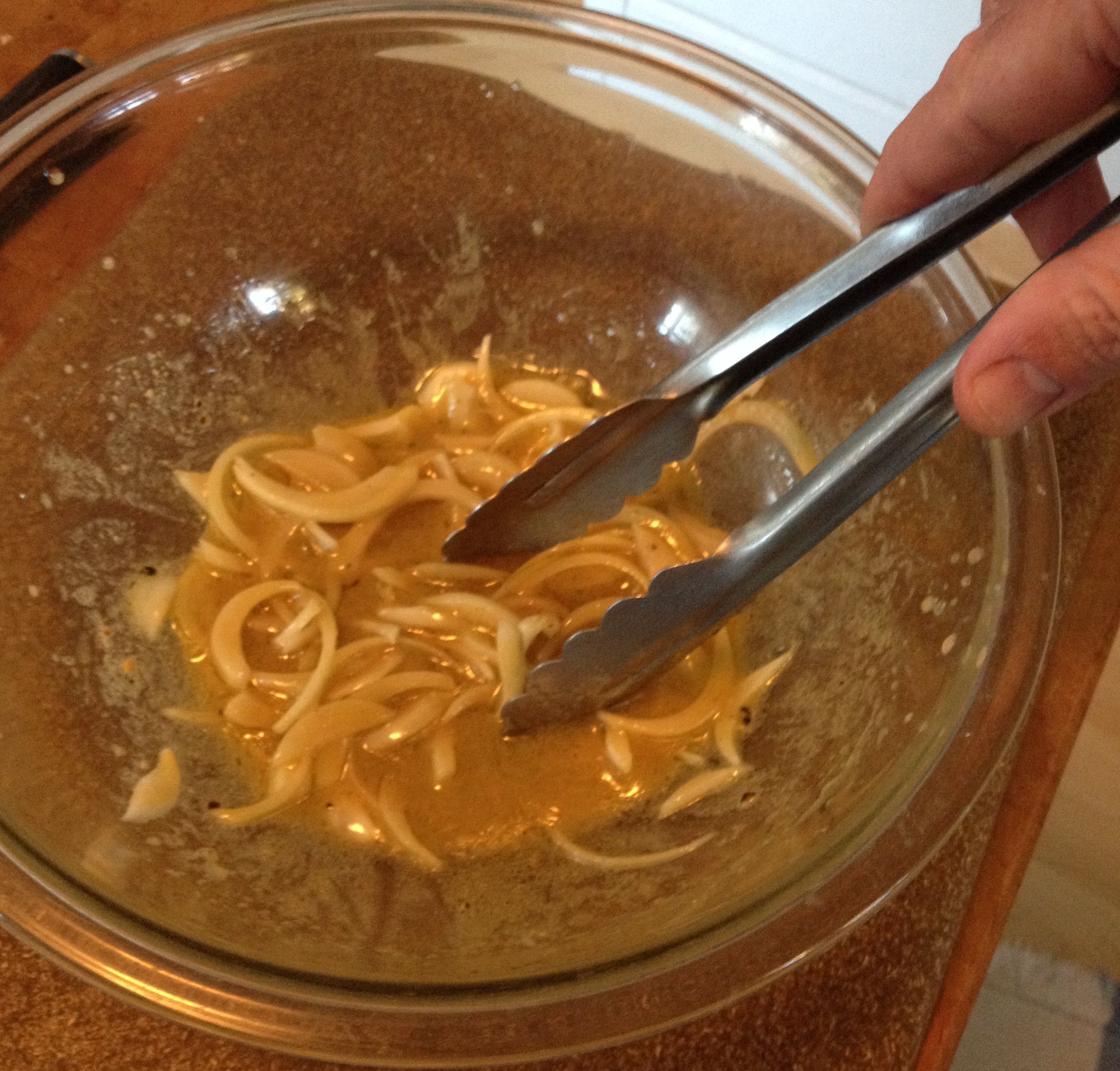 • Meanwhile, make vinaigrette in a medium mixing bowl. Whisk together mustard, salt, pepper and vinegar until combined. Continue to whisk while drizzling in oil. Stir in onions to thoroughly combine.