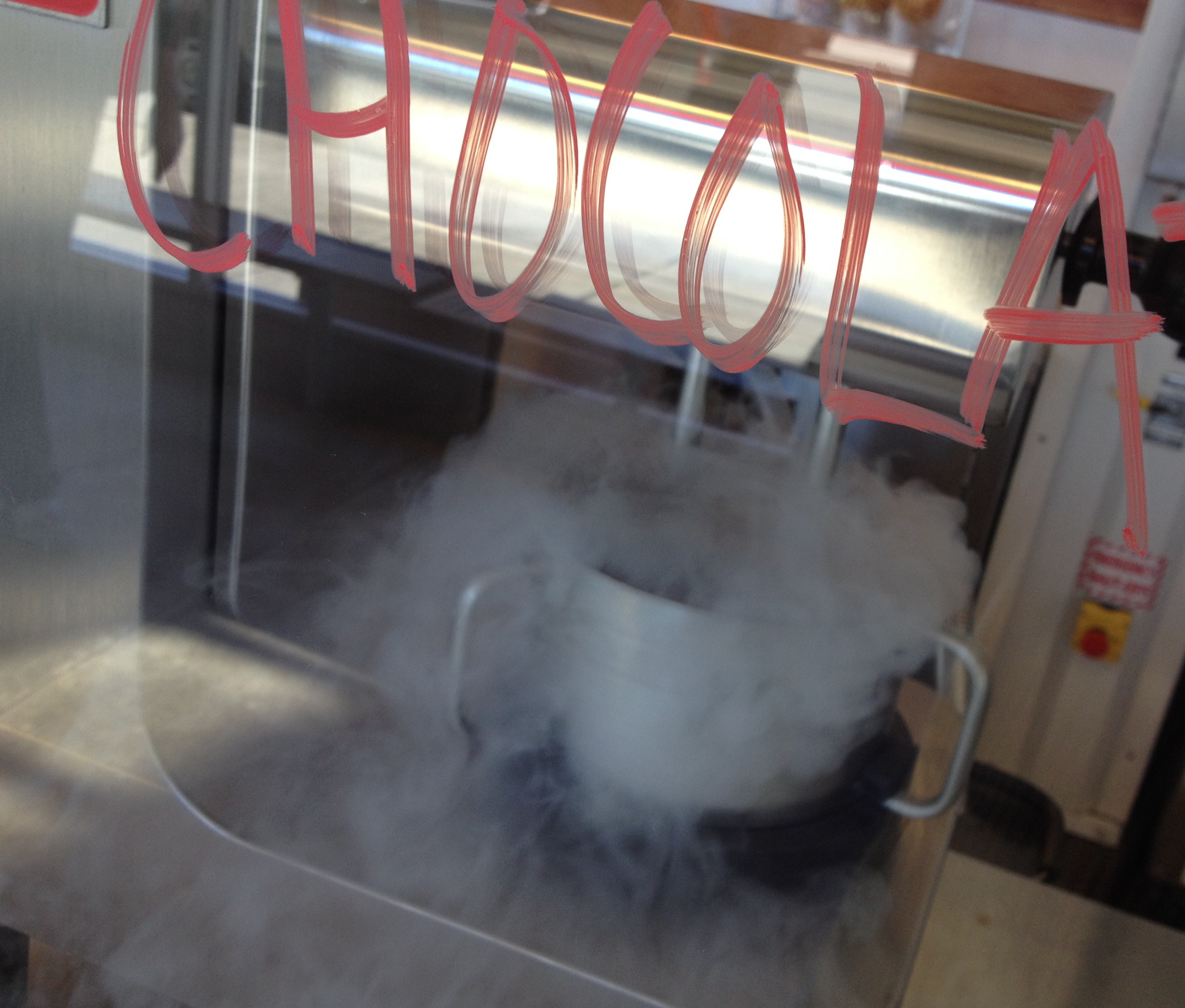 With my top spots checked off the list, I had time to tackle the “if there’s time” list so I dashed across the Bay Bridge toward Berkeley for stops at two old standbys: The Spanish Table and Berkeley Bowl West. After that and knowing that I wasn’t going to beat rush hour traffic anyway, I decided to treat myself to some ice cream at the Oakland branch of Smitten Ice Cream. Smitten features made-to-order ice cream using a kitchen mixer-like setup with an injection of liquid nitrogen. In addition to creative, delicious flavors featuring local ingredients, it’s entertaining to watch your ice cream being made in just a couple of minutes while a haunted house’s worth of fog rises from the mixer bowl. Freezing the ice cream at such a low temperature (-321° F.) in such a short period of time makes an incredibly smooth and dense final product. I had the seasonal flavor of the month—Blood Orange with Pistachio Cookies. It was light in flavor with a tart kick from the blood oranges and little crispy texture from the cookies. An excellent way to end a great day—fortified to face the traffic.